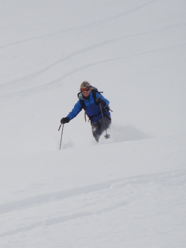 Chrissy descending from the Brèche de Bérard. The grin on her face says it all. We were so lucky with the off piste conditions for the descent into the Buet valley.