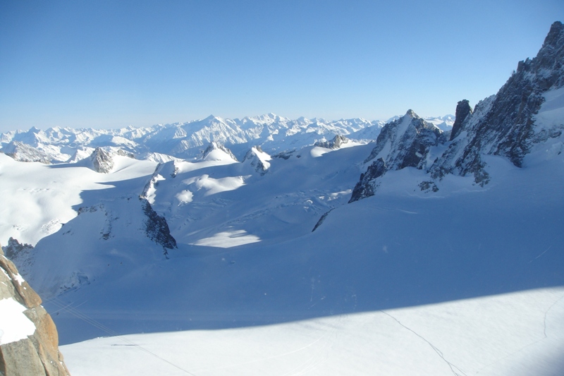 View of the start of the Classic Vallée Blanche. Gros Rognon left of centre and the Helbronner on the Italian side on the near ridge. — at Aiguille du Midi, Chamonix, Mont-Blanc.