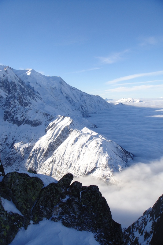View from the top of the Poubelle at the top of the Bochard ski lift. The Aiguille du Midi is just visible on the left of the shot. — at Grands Montets 3300m.