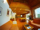 The living area of the chalet in Chamonix has cosy seating, an open fire and fantastic views of Mont Blanc and the glaciers.