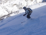 Breezy skiing off piste at Les Grands Montets Chamonix Mont Blanc. Grands Montets has more technical terrain for the advanced and intermediate skiers.