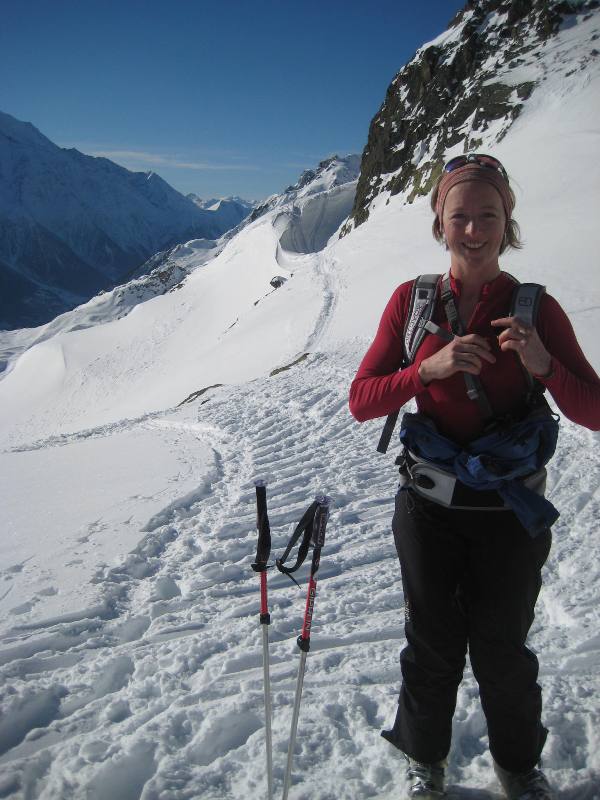 Kirsty at the point where the skin up starts and the kit changes from downhill to ski touring mode. Time to put the effort in to get uphill.