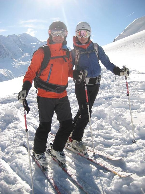 Kirsty and Leon ready for the ski down having skinned up to Col de Dards from La Flegere. Spot Mont Blanc in the background.