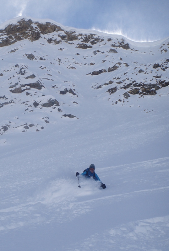 Carolyn waist deep in powder off the Youla lift in Courmayeur. The strong wind high up sending fingers of snow off the ridge and being caught by the sun. The skiing was worth the trip through the Mont Blanc tunnel from Chamonix.