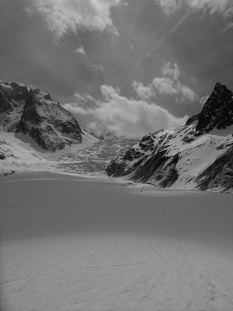 Looking up the glacier towards Salle a Manger under the ceracs with the Requin Refuge on the Right hand side.