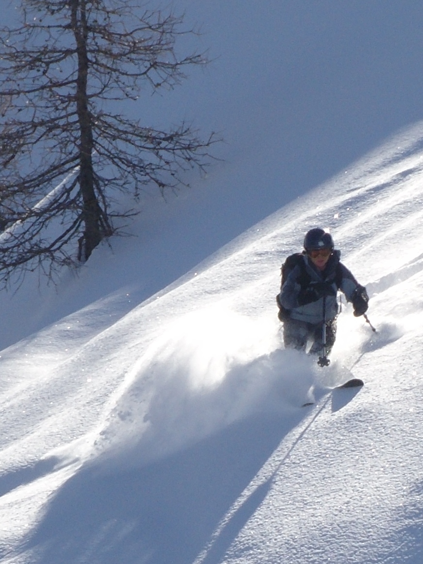 Breezy makes skiing look effortless as she lays down fresh tracks in light sparkly powder snow off the Mid Station of the Aiguille du Midi in Chamonix Mont Blanc.