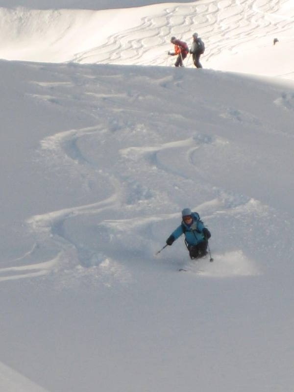 Carolyn skiing powder having ski toured from La Flegere over to the Col de Dards above Lac Blanc. Great untracked powder snow all the way back into domain.